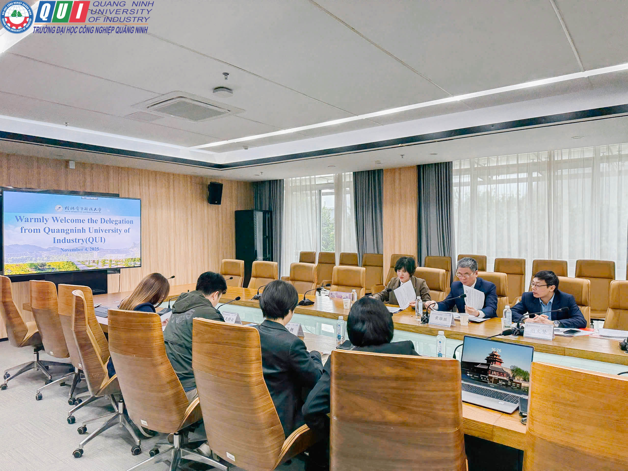 Ngày 05 tháng 11 năm 2025, trong khuôn khổ chuyến công tác và làm việc tại Trung Quốc, đoàn công tác Trường Đại học Công nghiệp Quảng Ninh do TS. Hoàng Hùng Thắng - Hiệu trưởng Nhà trường làm Trưởng đoàn đã có buổi làm việc, trao đổi hợp tác và ký kết Biên bản ghi nhớ hợp tác (MOU) với Viện Hợp tác và Trao đổi Quốc tế, Trường Đại học Khoa học Kỹ thuật Điện tử Quế Lâm (Guilin University of Electronic Technology - GUET).