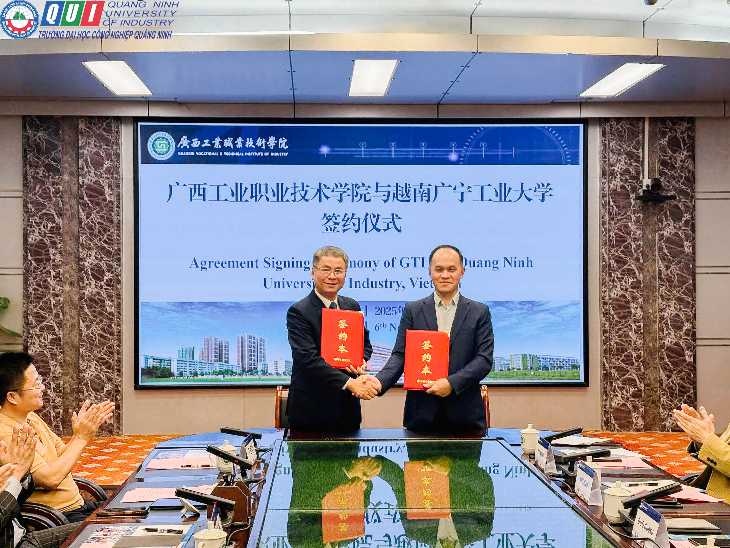 Kết thúc buổi làm việc, hai bên Trường Đại học Công nghiệp Quảng Ninh và Học viện Kỹ thuật Công Nghiệp Quảng Tây đã ký kết Biên bản ghi nhớ hợp tác (MOU), đặt nền móng cho việc triển khai các chương trình hợp tác cụ thể trong thời gian tới. Sau lễ ký kết, đoàn đã tham quan hệ thống phòng thí nghiệm công nghệ cao, trung tâm thí nghiệm, thực hành công nghiệp thực phẩm.