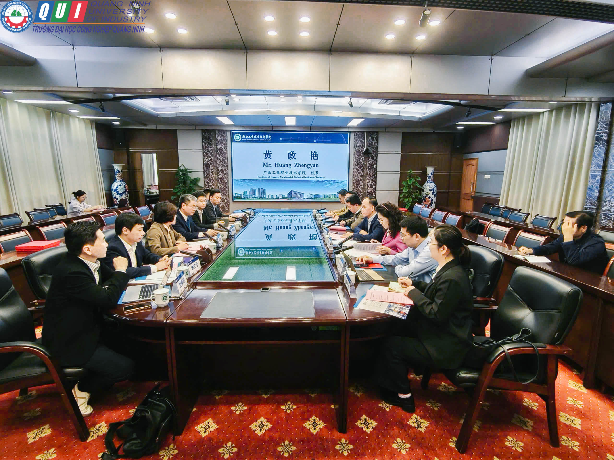 Chuyến đi nằm trong khuôn khổ chương trình hợp tác quốc tế về đào tạo, nghiên cứu khoa học và chuyển giao công nghệ, góp phần thúc đẩy quan hệ hữu nghị giữa hai bên.Tại buổi làm việc, đoàn Trường Đại học Công nghiệp Quảng Ninh đã được đón tiếp trọng thị bởi đại diện lãnh đạo và các đơn vị chuyên môn của Học viện Kỹ thuật Công nghiệp Quảng Tây, gồm có: Ông Hoàng Chính Diễm - Viện trưởng; Cô Trần Hoa - Trưởng phòng quan hệ quốc tế; Ông Vũ Kiến - Trưởng khoa sản xuất thông minh; Ông Lưu Tinh Di - Trưởng Khoa Khoa công nghệ internet; Ông Đa Câu Tư - Phó phòng Đào tạo. Ngoài ra tham gia đón tiếp và làm việc còn có Đại diện phía Doanh nghiệp ông Long Kiệt - Giám đốc nhân sự Công ty TNHH điện tử Tonly Việt Nam; ông Nhậm Học Lượng - Tổng giám đốc Công ty TNHH Công nghệ GeTech.