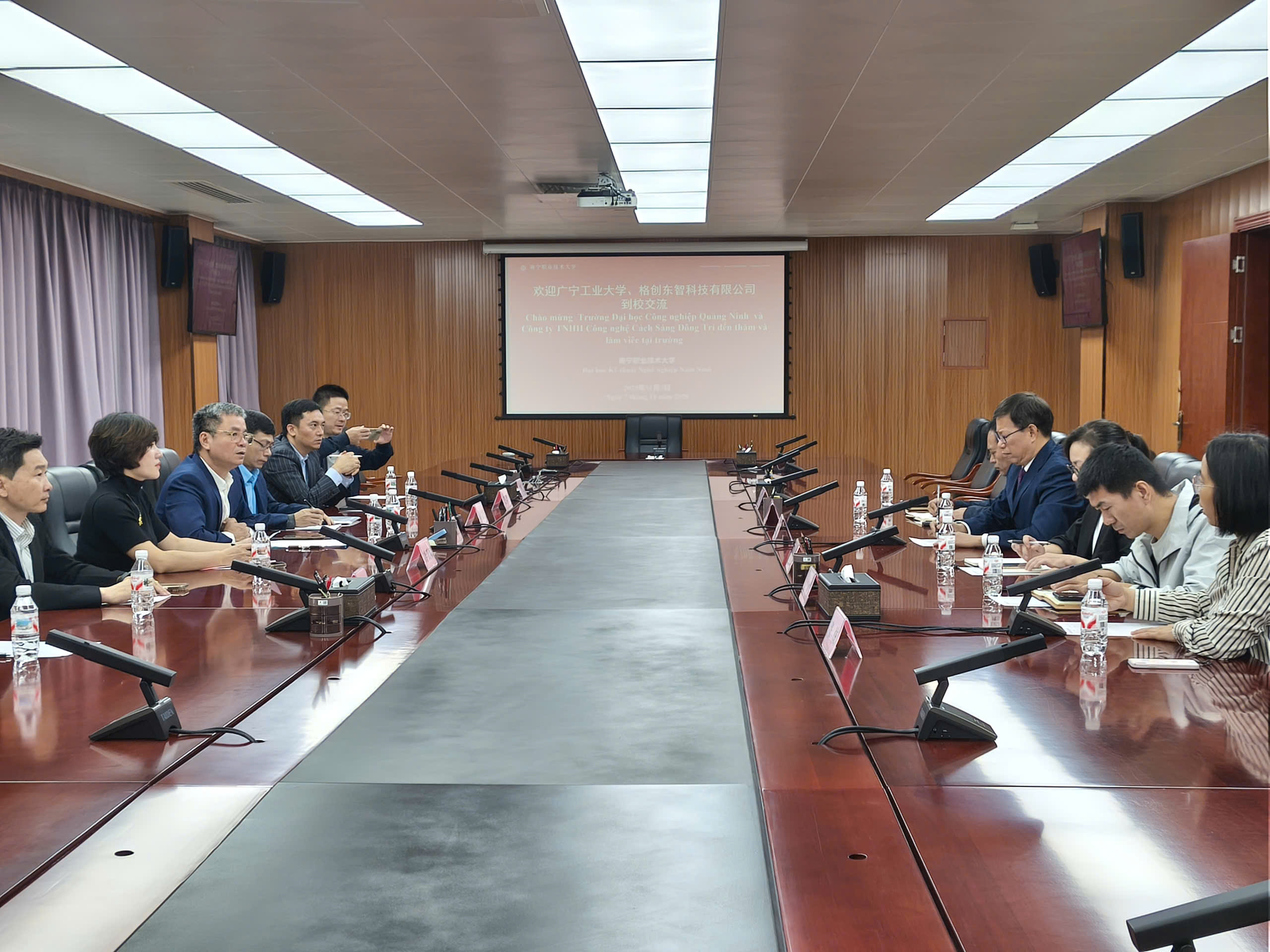 Tại buổi làm việc, hai bên đã trao đổi cởi mở, thân tình về khả năng hợp tác trong lĩnh vực đào tạo nghề nghiệp, chuyển giao công nghệ, trao đổi sinh viên - giảng viên, và đào tạo nhân lực theo nhu cầu doanh nghiệp. Đoàn công tác Trường Đại học Công nghiệp Quảng Ninh đã trực tiếp tham quan Viện Trí tuệ Nhân tạo và Viện Công nghệ Cơ khí, tìm hiểu mô hình đào tạo gắn với thực tiễn doanh nghiệp - một thế mạnh nổi bật của Trường Đại học Kỹ thuật Nghề nghiệp Nam Ninh. Hai bên cùng chia sẻ kinh nghiệm trong phát triển chương trình đào tạo ứng dụng, nghiên cứu khoa học - công nghệ và đổi mới sáng tạo trong lĩnh vực kỹ thuật, tự động hóa và trí tuệ nhân tạo.